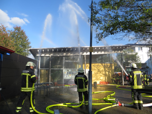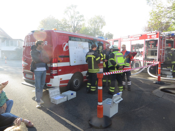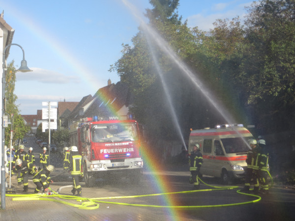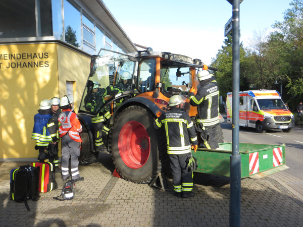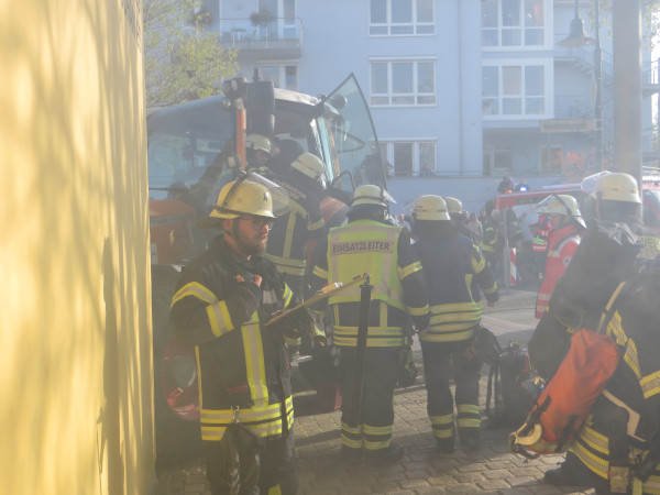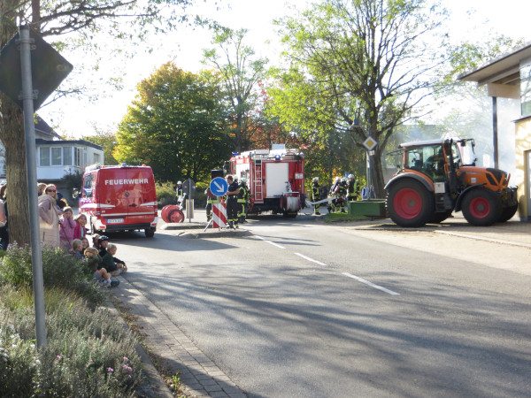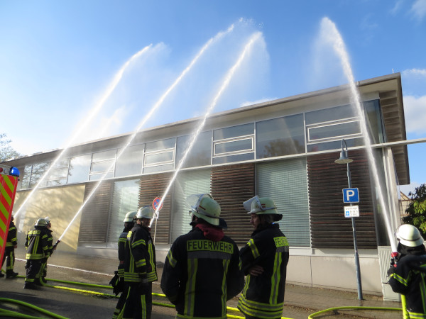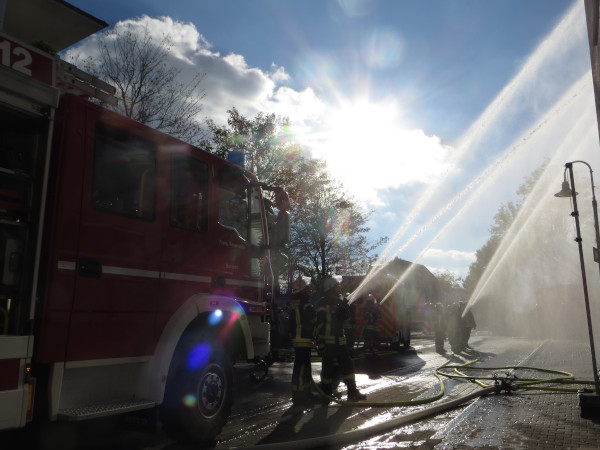 ÜbungsberichtDie zu bewältigenden Aufgaben laufen parallel ab. Ein Trupp kümmert sich um den verletzten Schlepperfahrer, während ein Atemschutztrupp in das Gebäude vordringt, um die Kinder zu finden. Mit dem Eintreffen weiterer Kräfte, stehen zusätzliche Atemschutztrupps zur Rettung und inneren Brandbekämpfung zur Verfügung. Von außen wird das Feuer ebenfalls bekämpft, angrenzende Gebäude mit einer Riegelstellung geschützt. Die Rettung des Schlepperfahrers läuft indessen in Zusammenarbeit mit dem DRK ab. Auf einem Spineboard wird der Verletzte vom Führerstand geholt und medizinisch versorgt. Auch die Personensuche im Gemeindehaus ist erfolgreich. Beide Vermissten werden nach draußen gebracht, wo sie von den Sanitätern betreut werden. Als dann auch das Feuer schwarz ist, kommt das Kommando ′Wasser halt′ und die Übung ist beendet.
